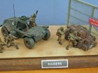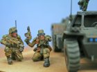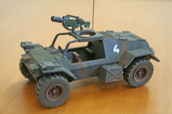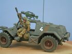 The vehicle was finished in Tamiya acrylics in a muted pattern. NATO Black was used as the base colour with NATO Green and brown streaks added. Adding a small quantity of desert yellow to the green, the highlight areas of the model were dry brushed. A thin wash of black mixed with green was applied to all surfaces to blend in the colours.
