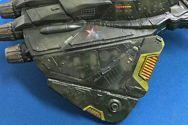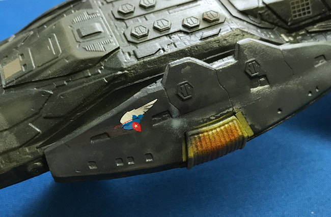 You may have noticed that I have carefully sprayed some light grey blast points where the vessel has been hit in engagements. Tamiya Light Grey is good for this – all heavily thinned to allow me to come in close with my airbrush and gentle backward pressure on the trigger – much easier to control the paint flow that way. Some tiny additions with silver on a small pointed brush and some black pastel chalk finish the job.