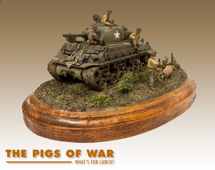 [/wptabcontent] [wptabtitle]Sherman M4, Normandy 1944. Tamiya – by Andy Burton[/wptabtitle] [wptabcontent]1:48th scaleThis small vignette is built around the excellent Tamiya 1:48th scale kit M4 Sherman Early production with two figures added of a driver and commander from the Tamiya 1:48th WWII U.S. Army infantry GI set. The Sherman has been extensively detailed using the Hauler etched brass detail set and Hedge cutter designed for this model plus various scratch built details including many tiny bolt heads, an MV clear lens for the headlight and drilled drainage holes for all the armoured fittings, plus many other small details. The model was airbrushed using the pre shade and high light method with Tamiya acrylics and weathered using artists oils and various pigments etc. the figures, tools and details were painted with Humbrol enamels and citadel acrylics. Stowage on the model is from Tamiya’s 1:48th Jerry Can set plus tarp’s made from tissue, pack straps from lead foil and tie down rope from fine string. The base is made up from polystyrene blocks to raise the ground for the hedge row, some model railway cobblestone road sections, Polyfilla and crushed cat litter groundwork, woodland Scenics long grass and Fine leaf foliage for the hedgerow.