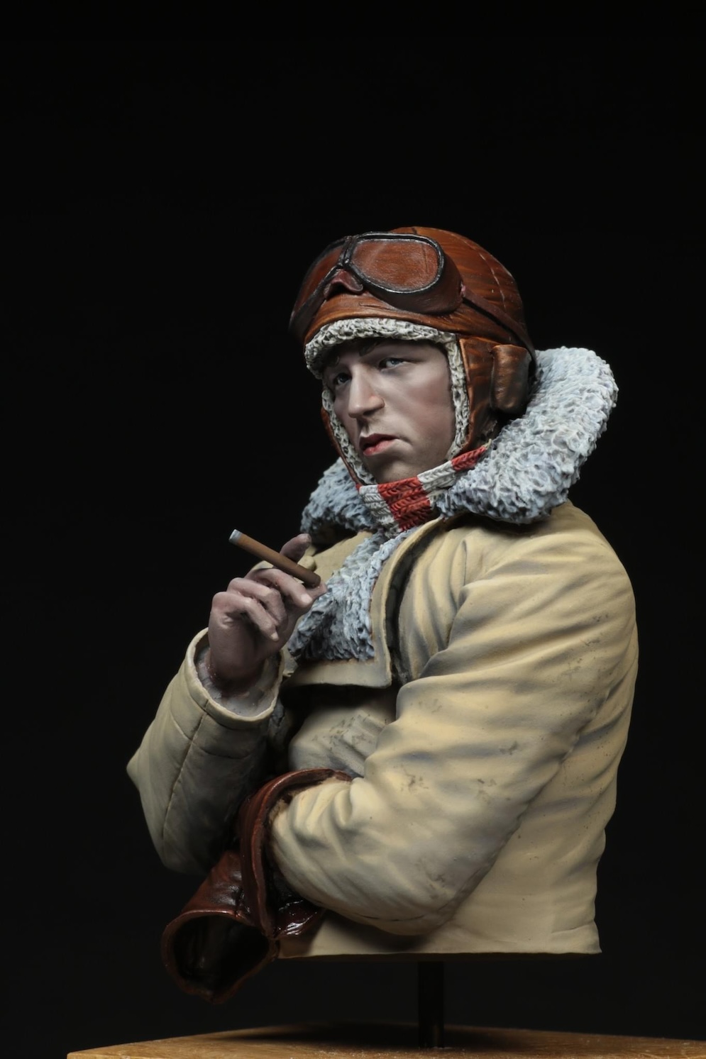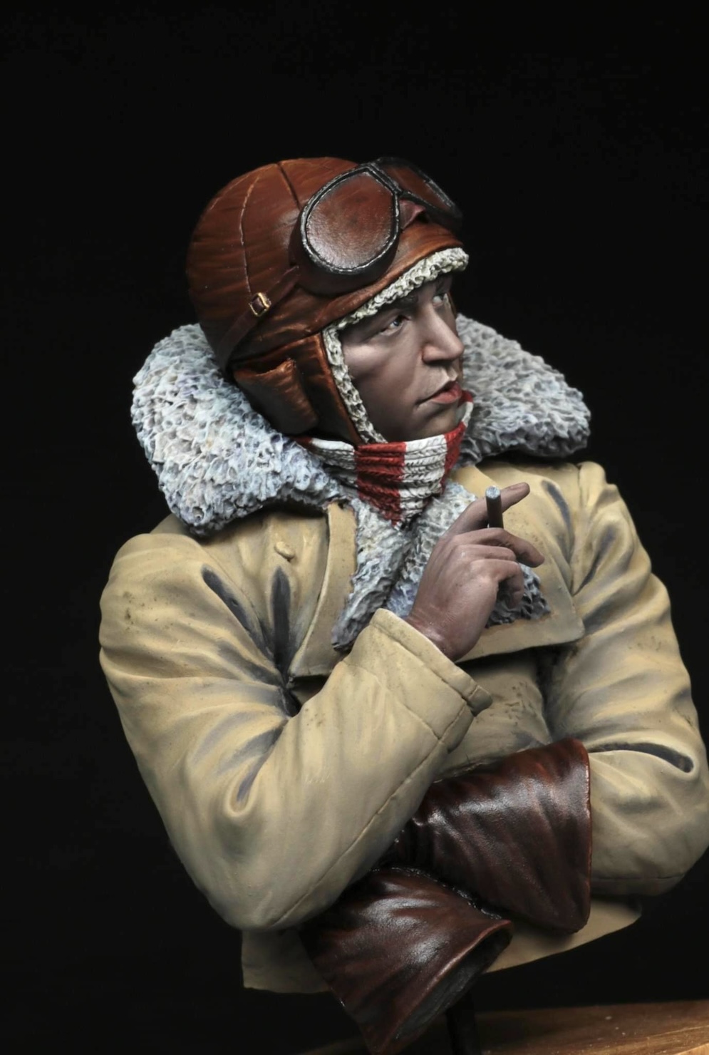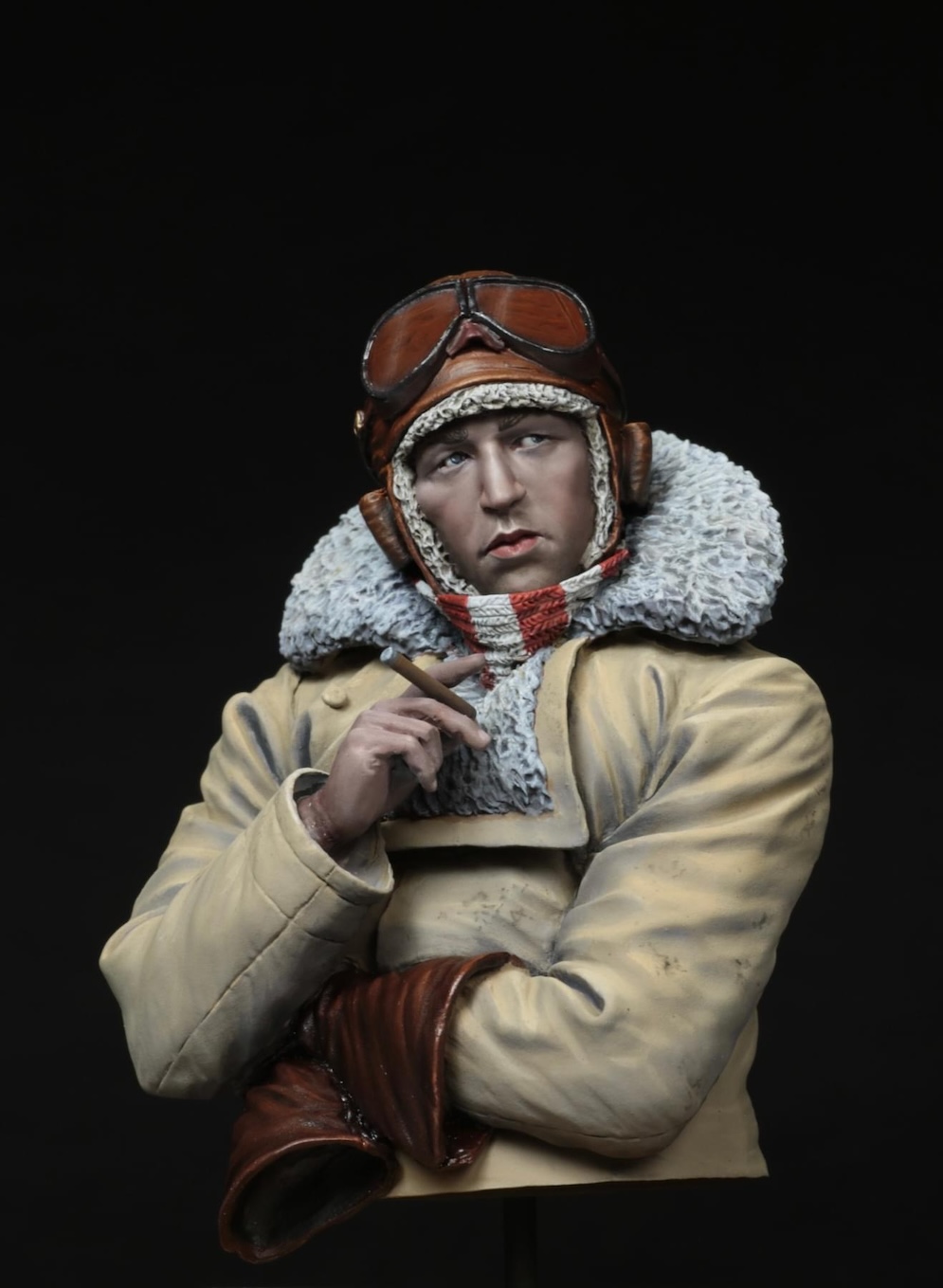 Life Miniatures – The Few, scale 1:10. He is painted mainly in oils over Alclad primer with acrylics only being used on the oxygen hose. Printers inks and oils used for metals.
