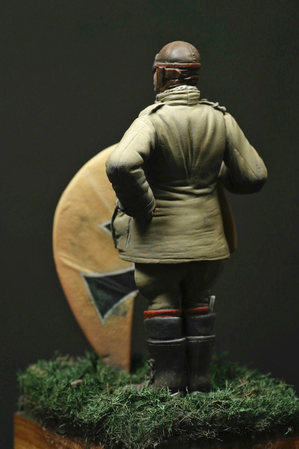 The 120mm scale figure cast in resin was a straightforward build. The radio jack was connected to the flying helmet using 3amp fuse wire while the hose for the oxygen mask was made from plastic rod.