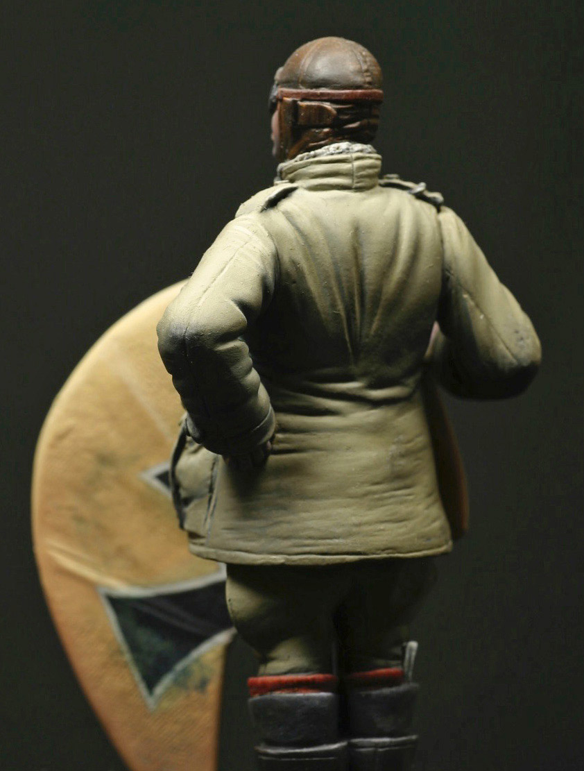 The figure was painted in Tamiya acrylics with a clear glaze used for the lenses of the flying goggles. The yellow of the lifejacket was toned down by adding Desert Yellow to flat yellow.