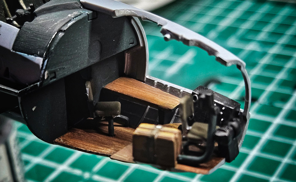 I scratch built a gun sight from clear plastic and painted black – the same approach for the rear radar station.