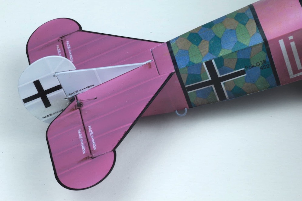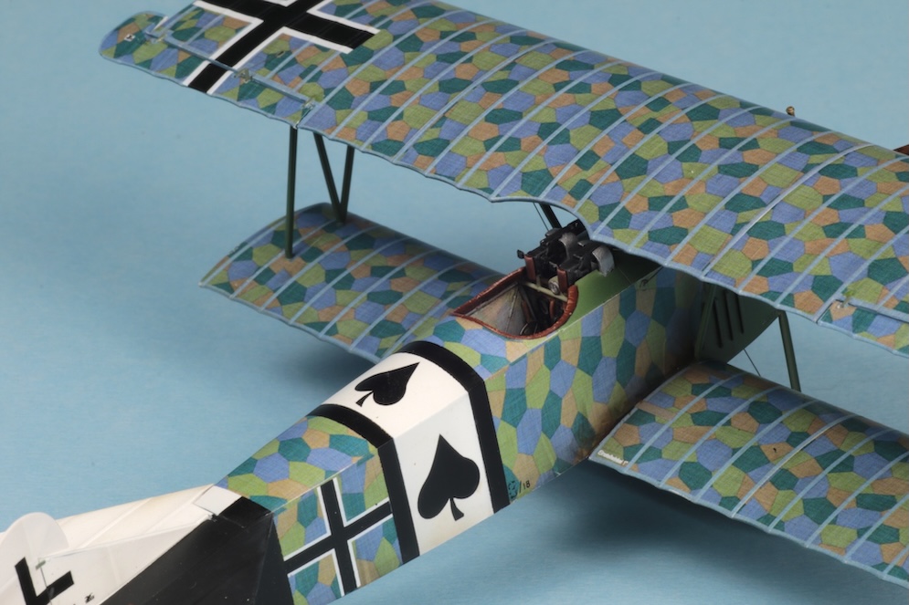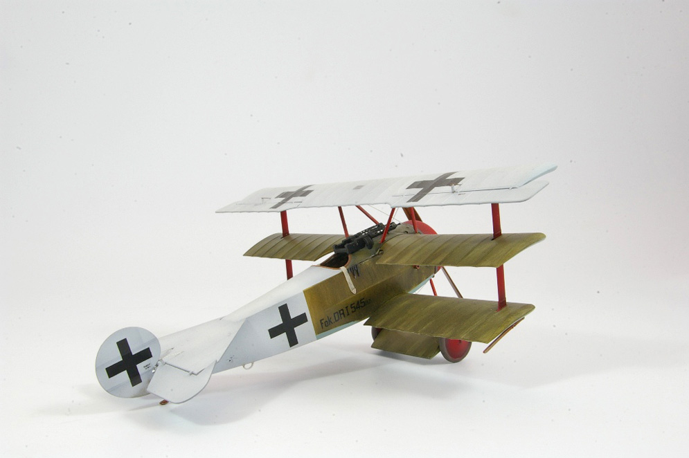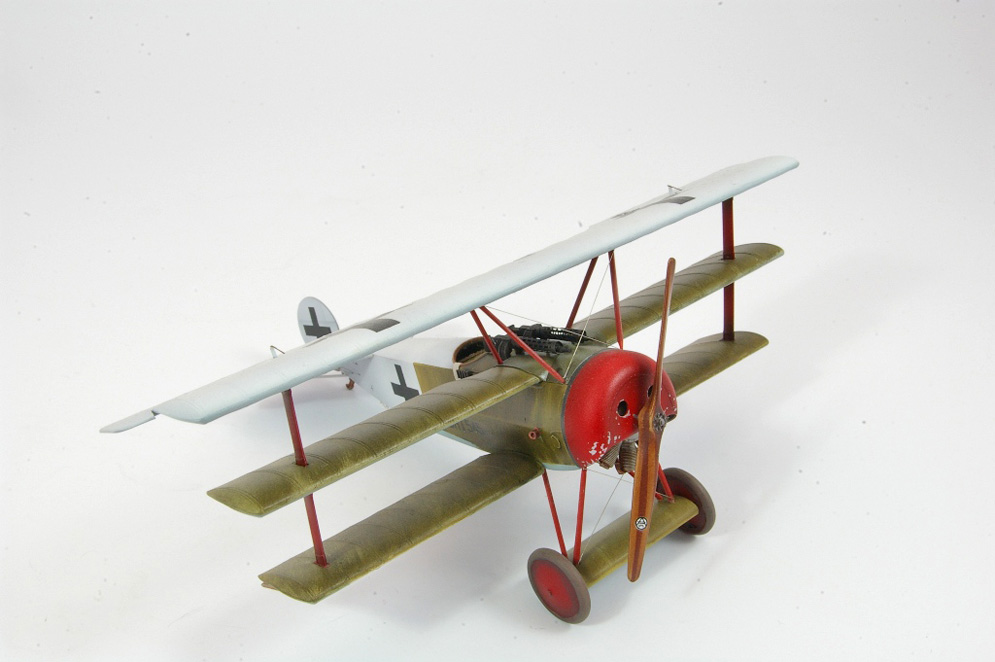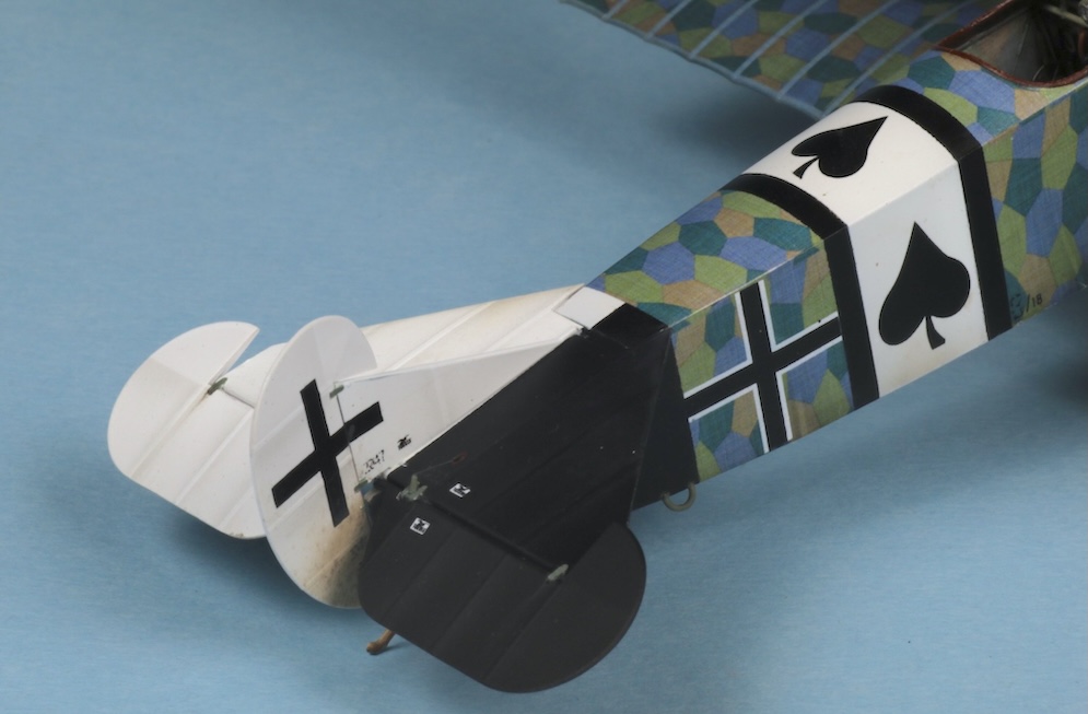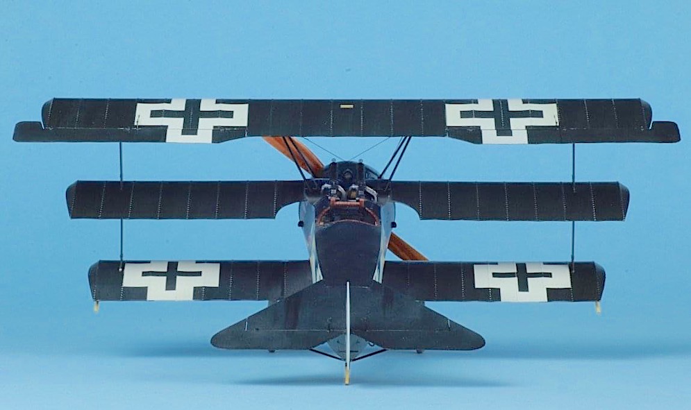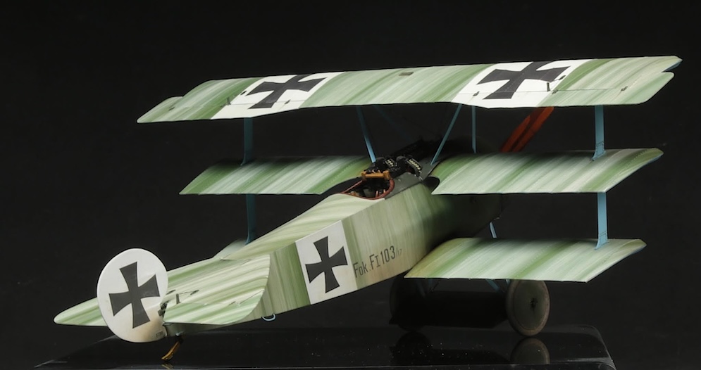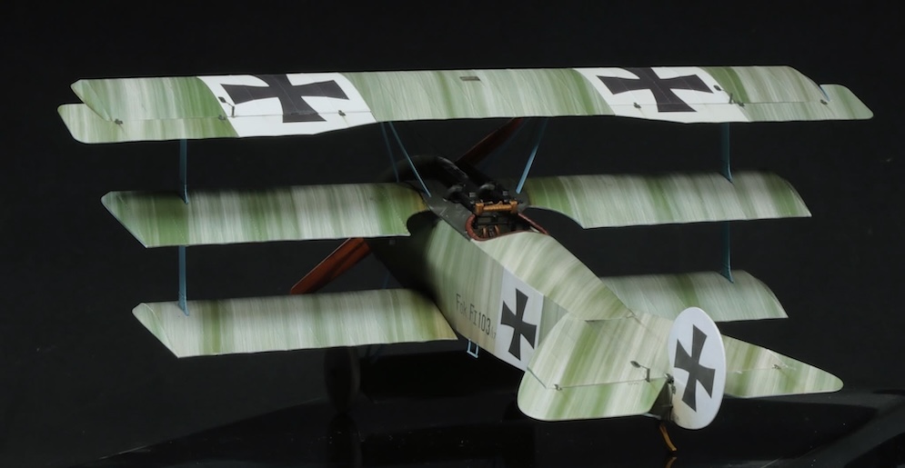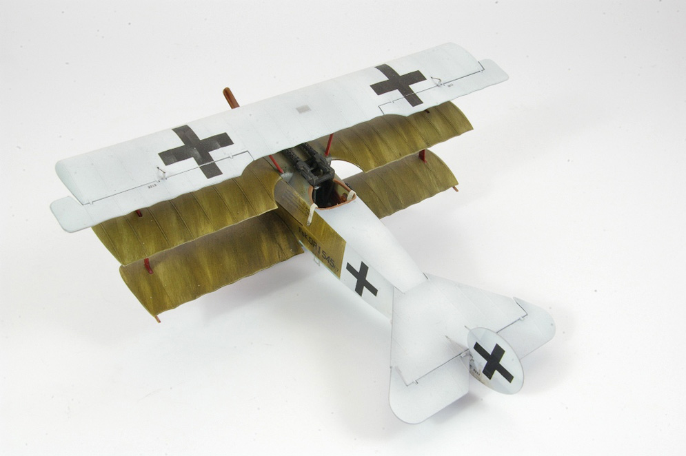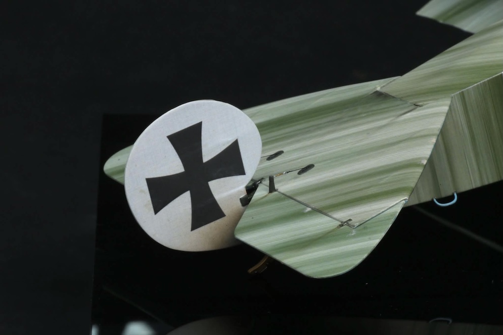 I must admit that while I find rigging 1:32 scale W.W.1 aircraft relatively easy (if a little tedious) using commercially available turnbuckles and elastic thread, I am a lot less confident when rigging 1:48 subjects. Here I have simply used steel wire rolled straight under a steel ruler on top of several thicknesses of printer paper and stuck to the bases of the struts with white glue. The Fokker Dr. 1 carried only a few bracing wires and control wires, so I felt I could get away with this. I don’t think that this will suffice for models with more complex rigging though – especially some of the rather terrifying looking aircraft with two or three bays of struts or some of the British subjects with doubled up bracing / flying wires. I think that a little more experimentation will be called for here before I take another look at my Bristol Fighter or a DH2!!