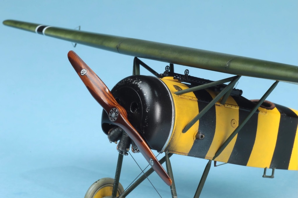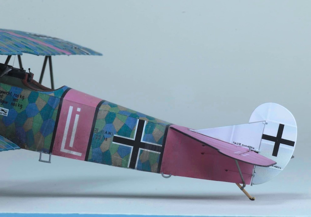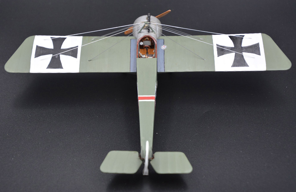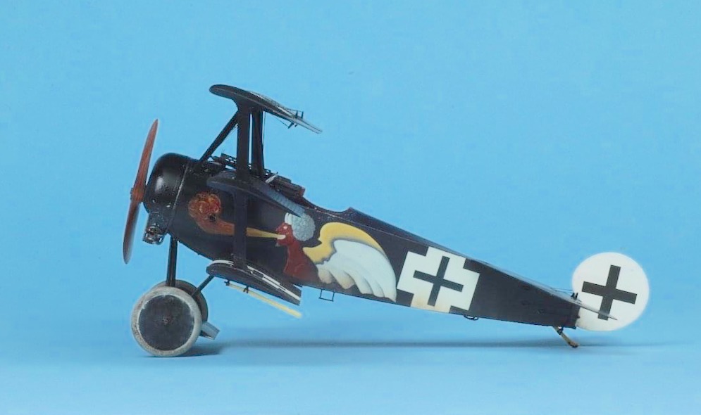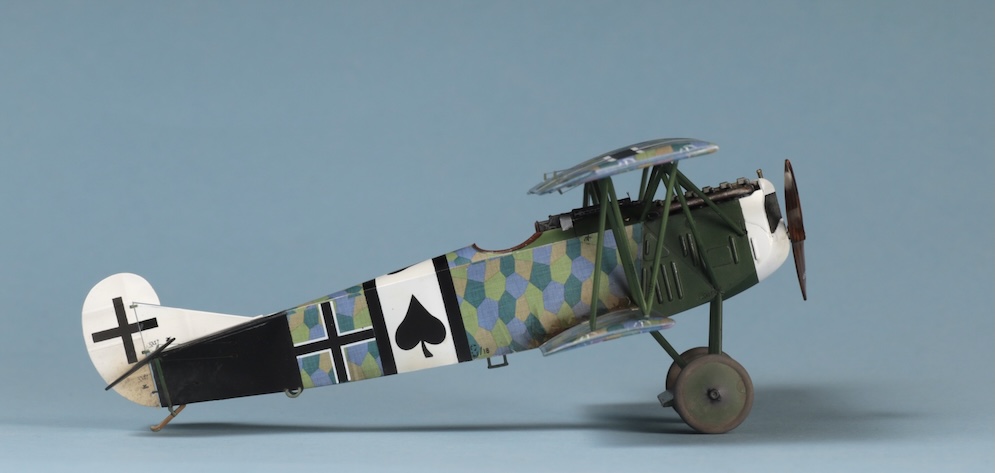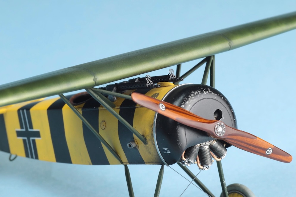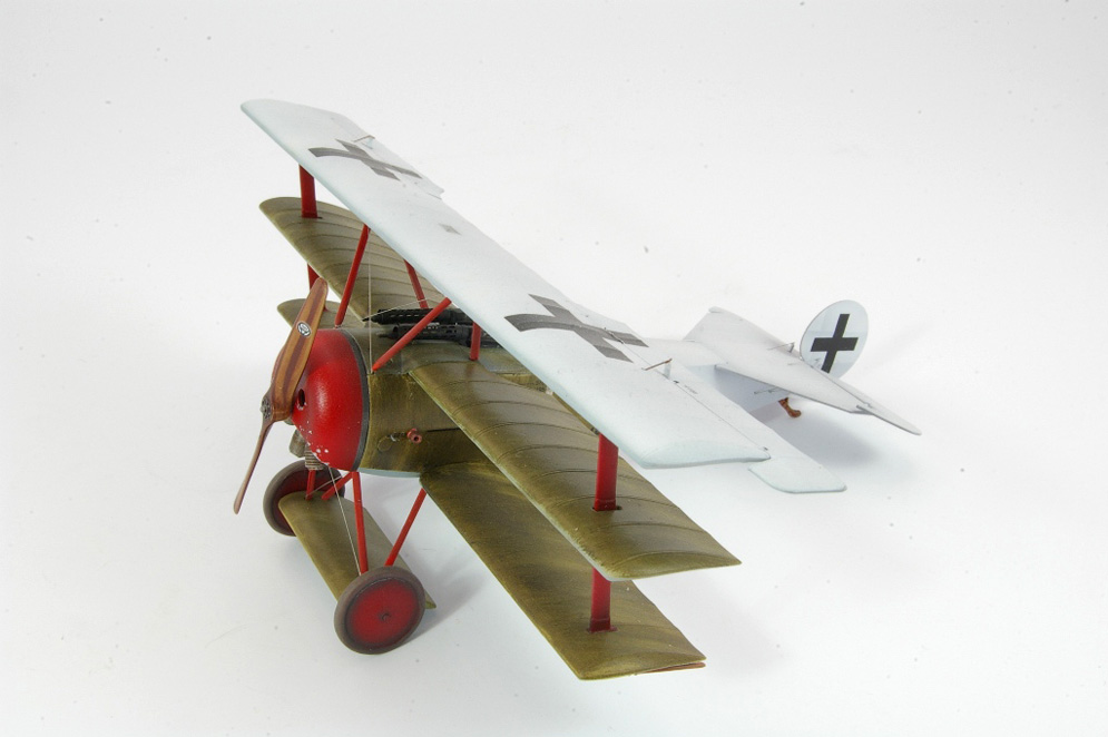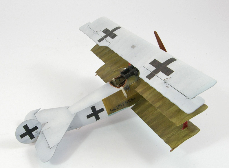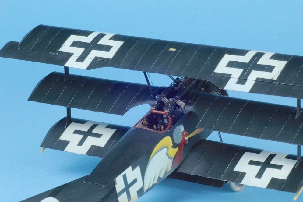 I must admit that while I find rigging 1:32 scale W.W.1 aircraft relatively easy (if a little tedious) using commercially available turnbuckles and elastic thread, I am a lot less confident when rigging 1:48 subjects. Here I have simply used steel wire rolled straight under a steel ruler on top of several thicknesses of printer paper and stuck to the bases of the struts with white glue. The Fokker Dr. 1 carried only a few bracing wires and control wires, so I felt I could get away with this. I don’t think that this will suffice for models with more complex rigging though – especially some of the rather terrifying looking aircraft with two or three bays of struts or some of the British subjects with doubled up bracing / flying wires. I think that a little more experimentation will be called for here before I take another look at my Bristol Fighter or a DH2!!