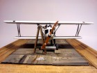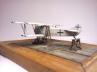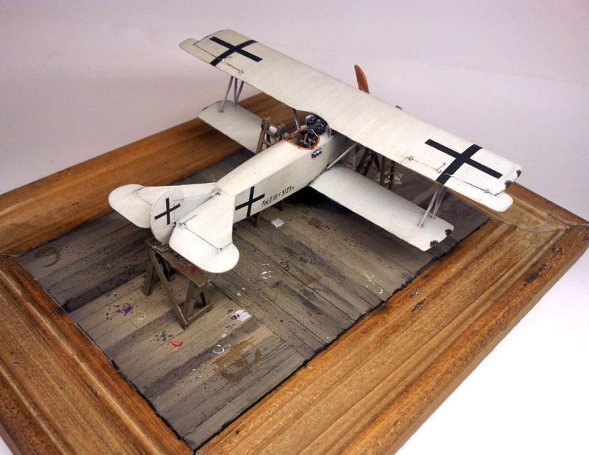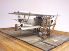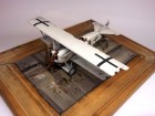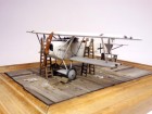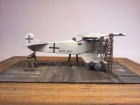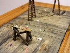 The hangar floor, stand, blocks and ladders were made from styrene; painted in Tamiya acrylics and stained with black oil paint. I finished with weathering products from AK interactive, Humbrol paints and oil paint. The dirty rags were made from cigarette paper. The paint stains on the floor are in every color used by the famous Flying Circus and if you connect them with a line you roughly get the silhouette of an Albatros D.III.