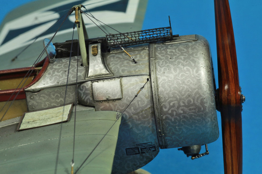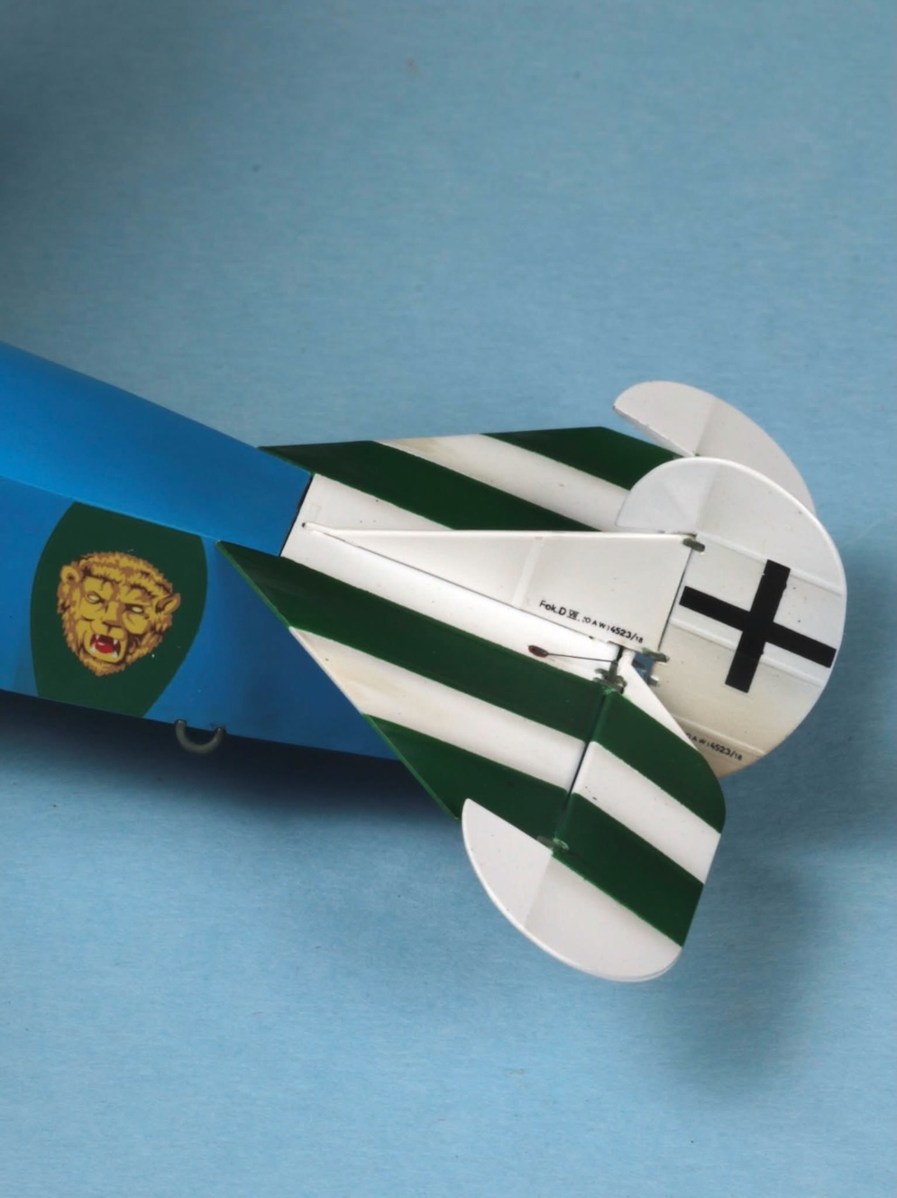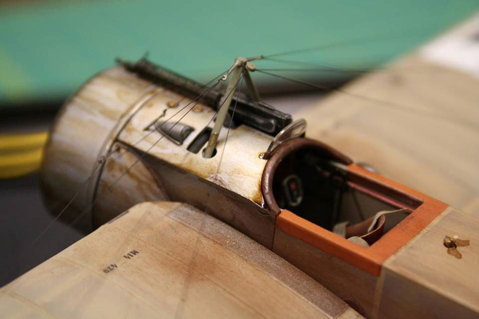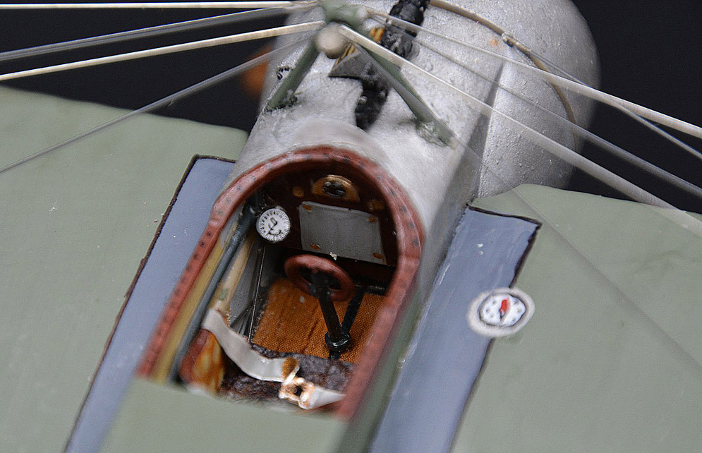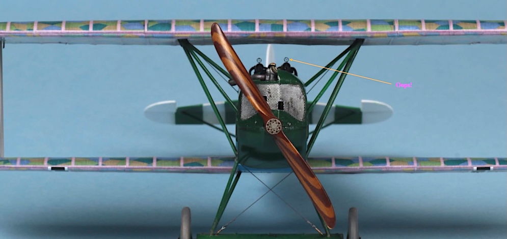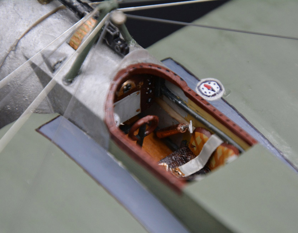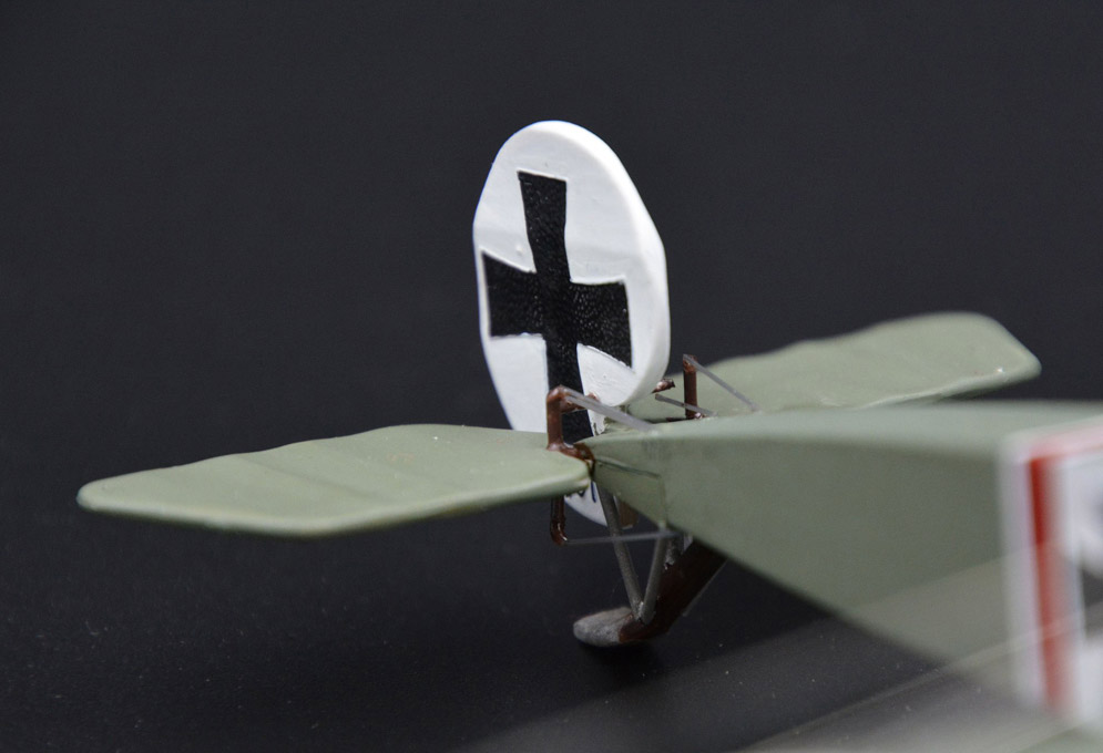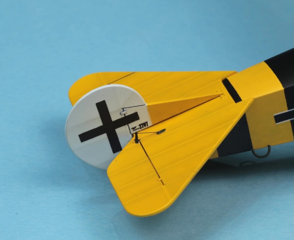 The aerial wire was made from thin elastic rigging thread with the lead in wire made from a piece of suitably thin surgical steel wire. This was rolled straight under a steel ruler and placed into a small pre-drilled hole in the rear fuselage. It was then joined to the aerial wire with a dot of white glue and painted black to match.