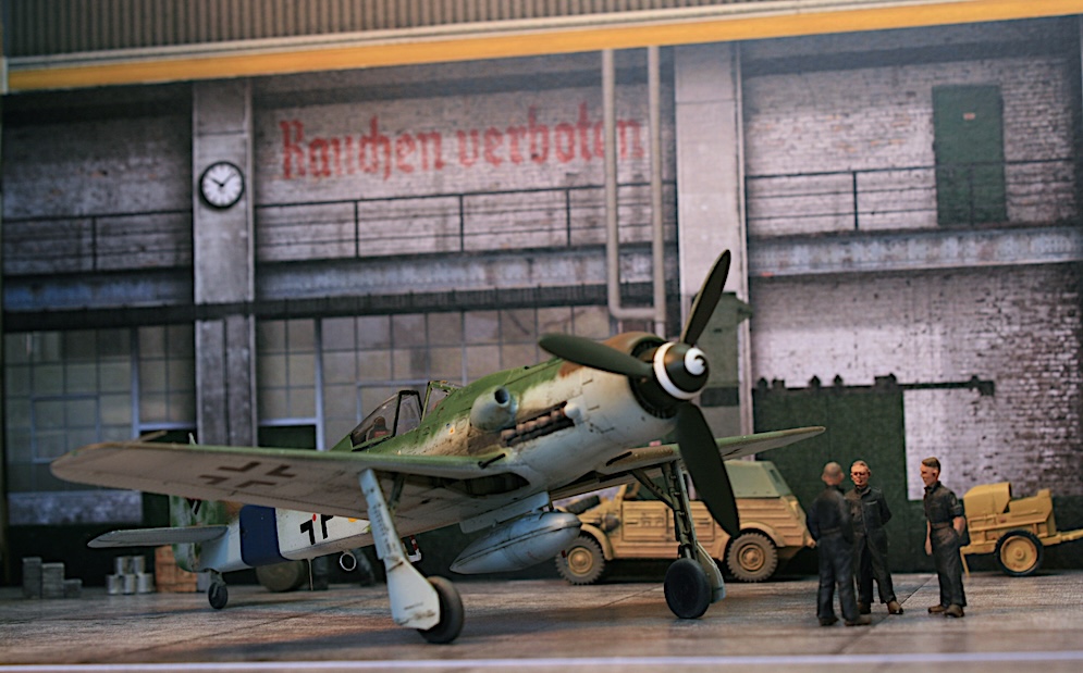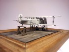 This is a Noy’s Miniatures hanger and figures are Gunthwaite RN gun crew in overalls. They were the nearest I could get for Luftwaffe ‘schwarzmanner’. To try things out I used some oil brusher colours from AMMO to dry brush the exhaust and wear on the wings, which maybe went OK.