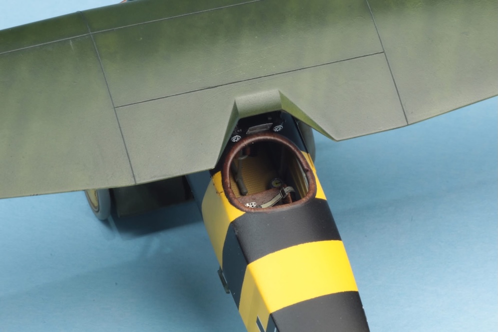 It appears that early versions of the aircraft had a weight attached to the aerial wire keeping it taut when the cockpit canopy was opened. This was not present on the later aircraft and the loose wire often caused damage to the paintwork on the rear of the canopy. This was replicated using Alclad Aluminium sprayed on before the main camouflage and masked using masking fluid dabbed on with a piece of torn sponge.