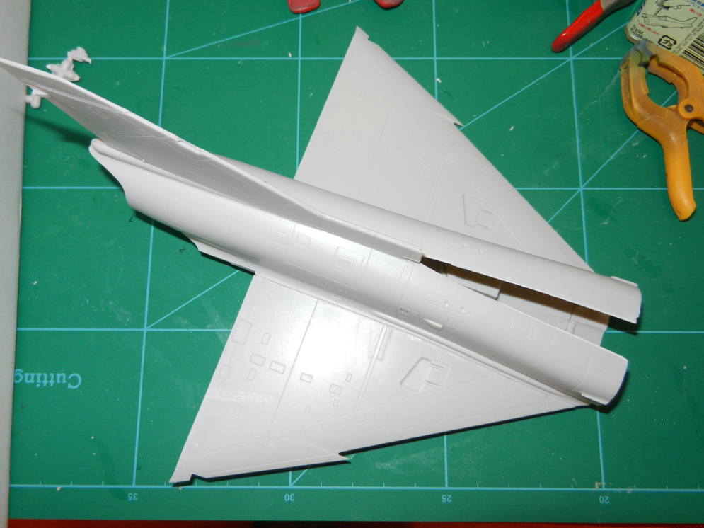 The kit is based on the Kinetic Kfir C2/C7 kit with a resin fuselage in front of the intakes and a resin spine. So the first thing to do is cutting the kit fuselage into pieces. This in turn requires some filler and sanding later on.