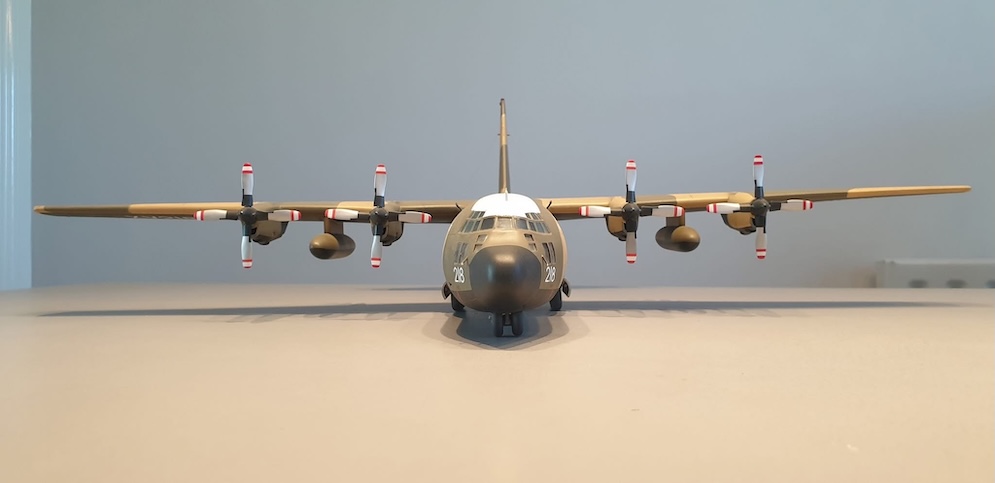 Black areas such as fin tip, refuelling probe and anti dazzle panel were masked and painted with Tamiya Nato Black, canopy was masked with Tamiya Tape and Gloss Black Alclad2 primer used before adding canopy decals and matt varnishing. The nose radome and fuselage ventral fin wear plates were sprayed an Olive Drab and dry brushed with a linen colour to simulate the Composite nature of the nose cone, finishing touch was using the Chrome Molotow pen to add the stainless steel nose cap, the oleo legs and refuelling probe tip.