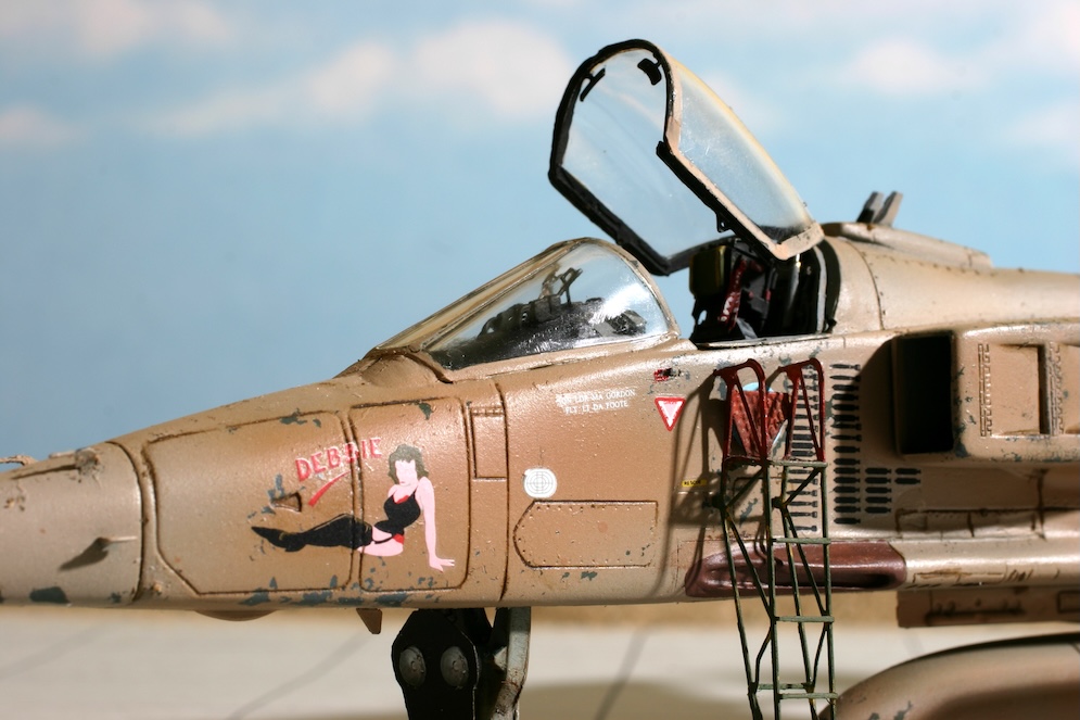 I used a Neomega Cockpit and burner cans, wheels, airbrakes and ladder from Xtraparts. I also made some new wheel bays to avoid the boxed in look but you can’t really see much. I painted it in Humbrol enamels the airframe was painted in the original wraparound scheme before adding latex masking fluid to the model with a sponge and spraying on varying shades of Desert Pink. The masking fluid is then rubbed off and can give a realistic chipping effect. Decals are Model Alliance.