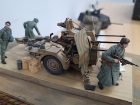 The two figures are from Verlinden and are my first venture into figure painting, which were painted with Vallejo acrylics. The figure at the rear should have had a spare mortar in his right hand but after being accidentally dropped, I drilled out the hand and replaced it with a Bren gun.