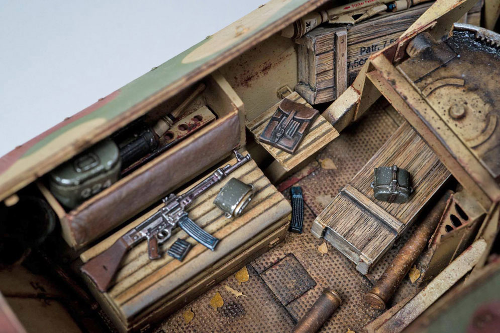 I added some camouflage netting (crepe bandage soaked in white glue) to fill the stowage bins inside the model.