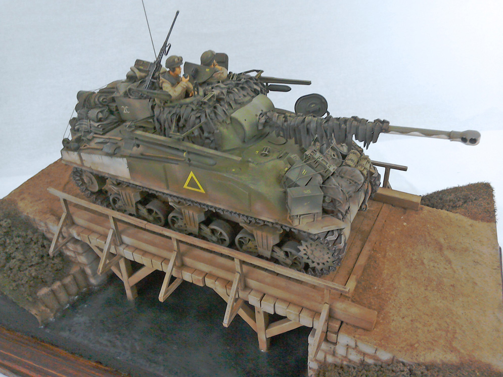 This diorama consists of the Tamiya 1:35th Sherman M4 A3 105mm & Infantry figures, the figures are straight from the box except for added texture to the helmets and tape straps added to the weapons. The Sherman has some extra details added such as scratch built turret mounted MG stowage brackets, wire grab handles on the turret and hatches, stud and sealing ring detail for canvas cover added to gun mantlet, drainage holes drilled to all fitting housings, etch chain added to filler caps, stowage retaining board and brackets to front, bolt detail to suspension and many other small details.