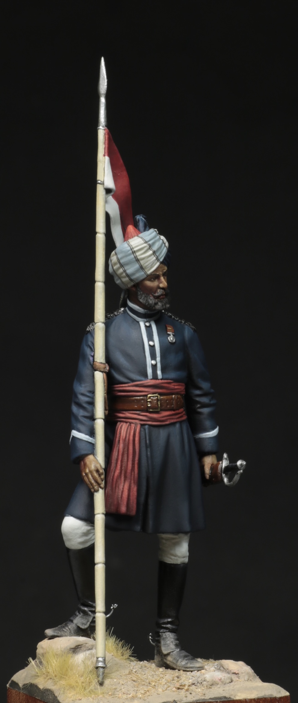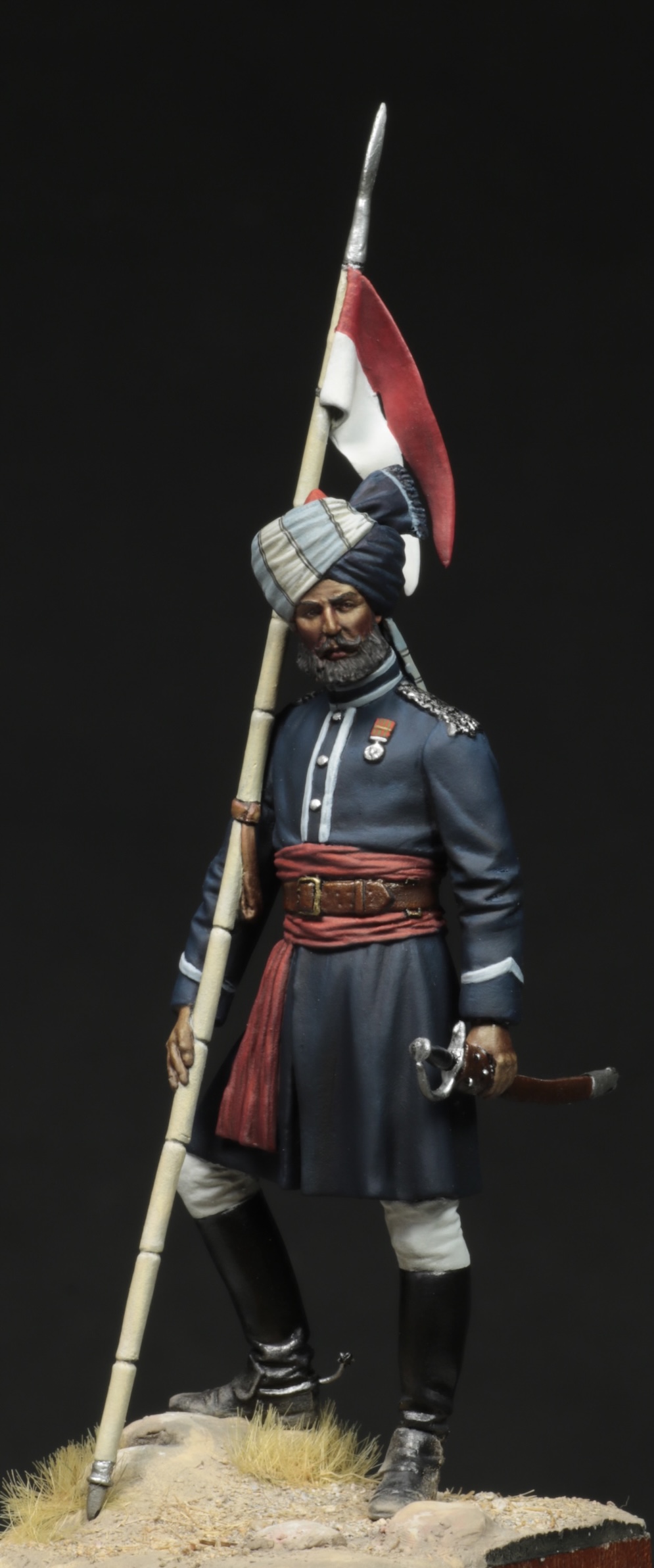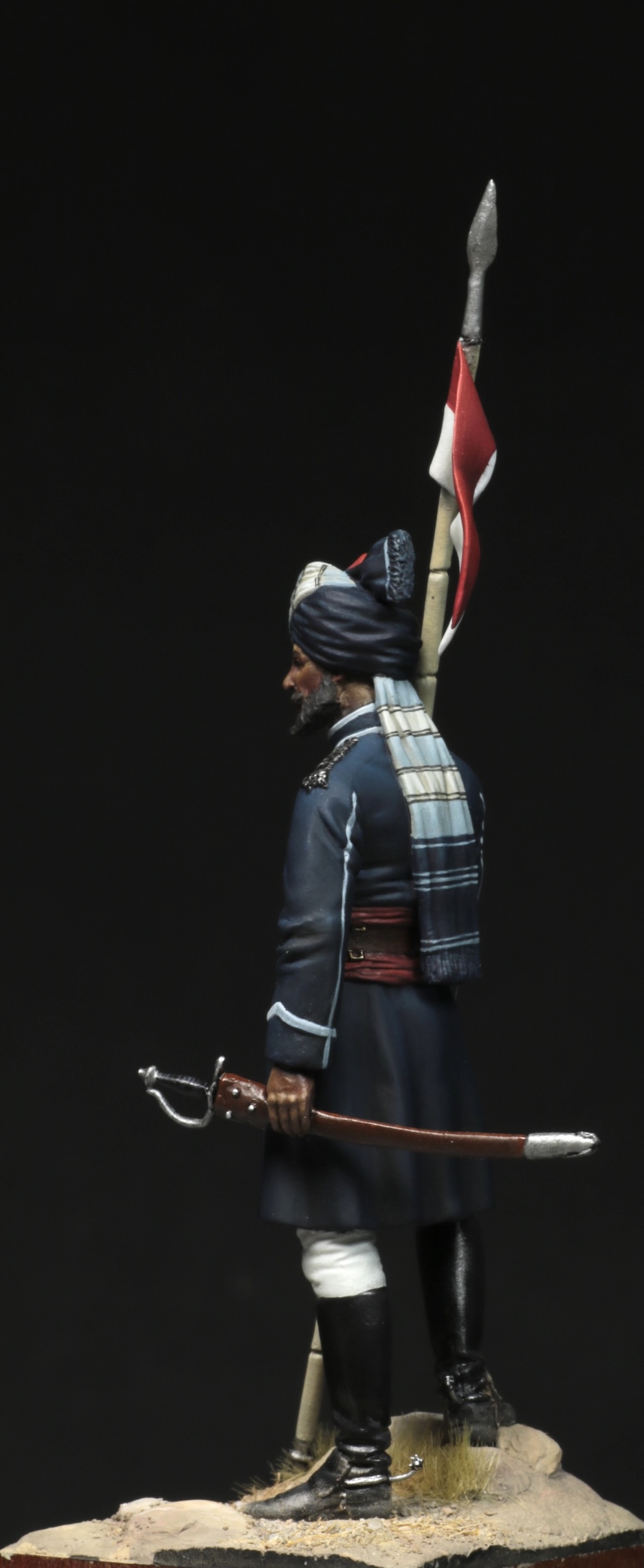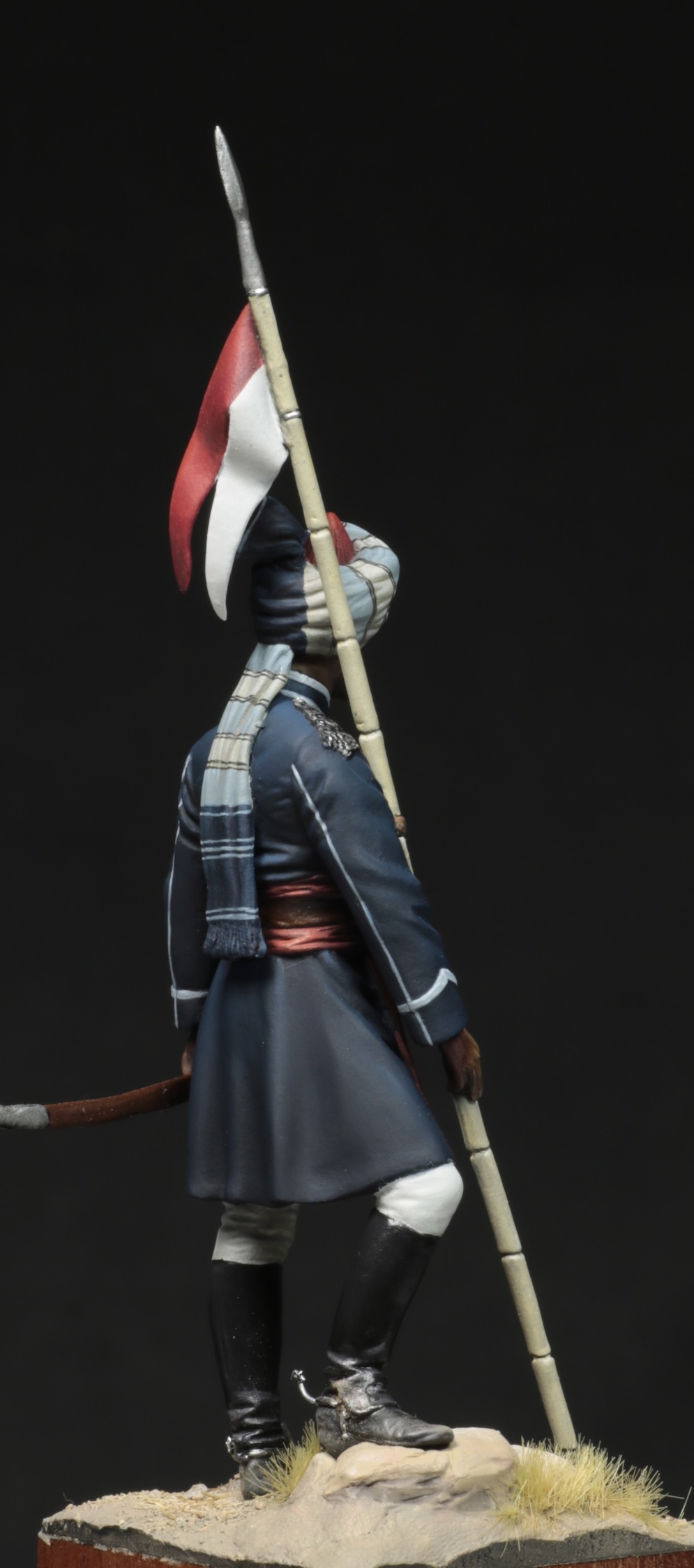 Researched the uniform as best as possible. Dark blue frock coat and not azure as art work provided. Turban is best guess based on art work by A C Lovett.