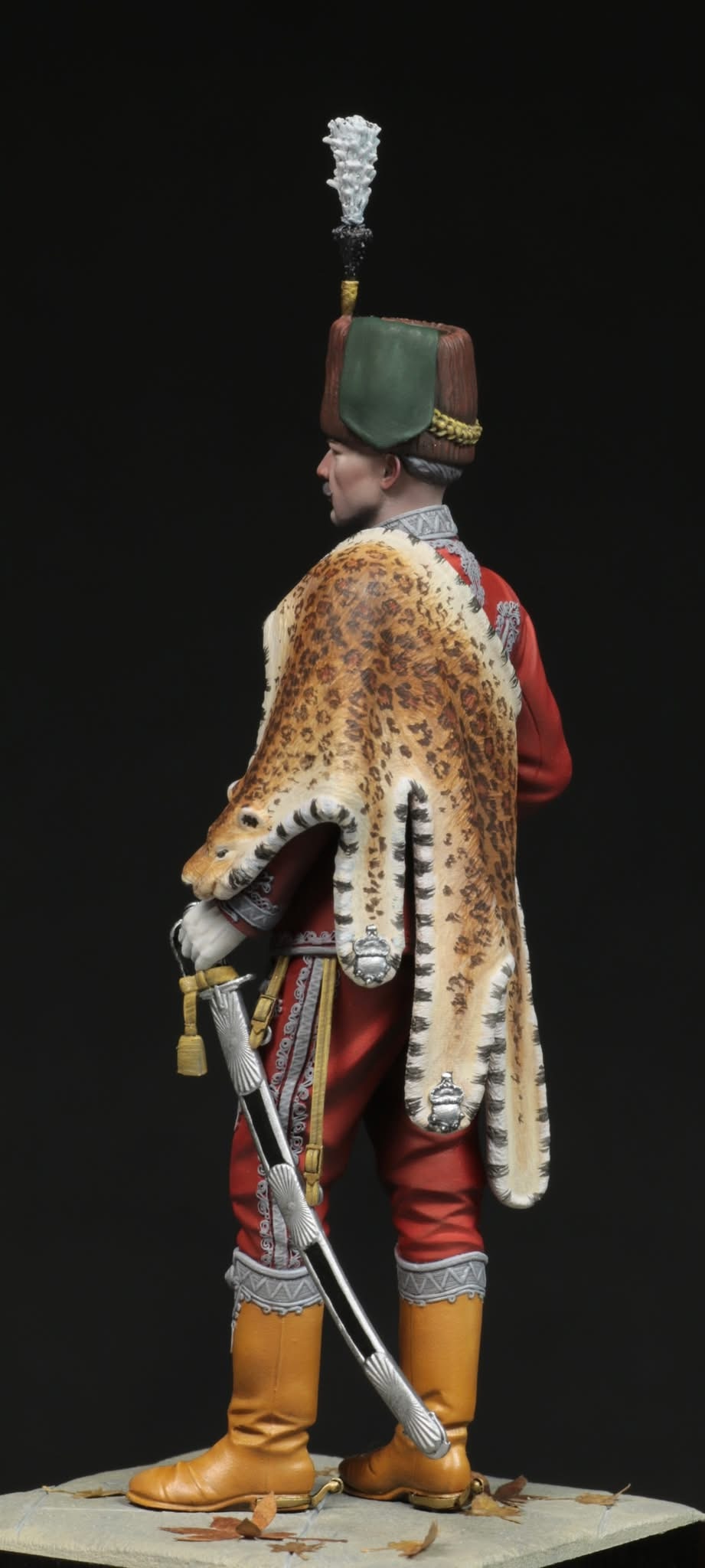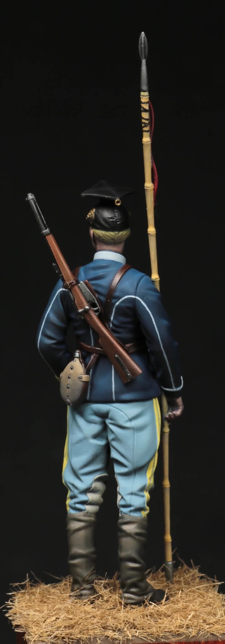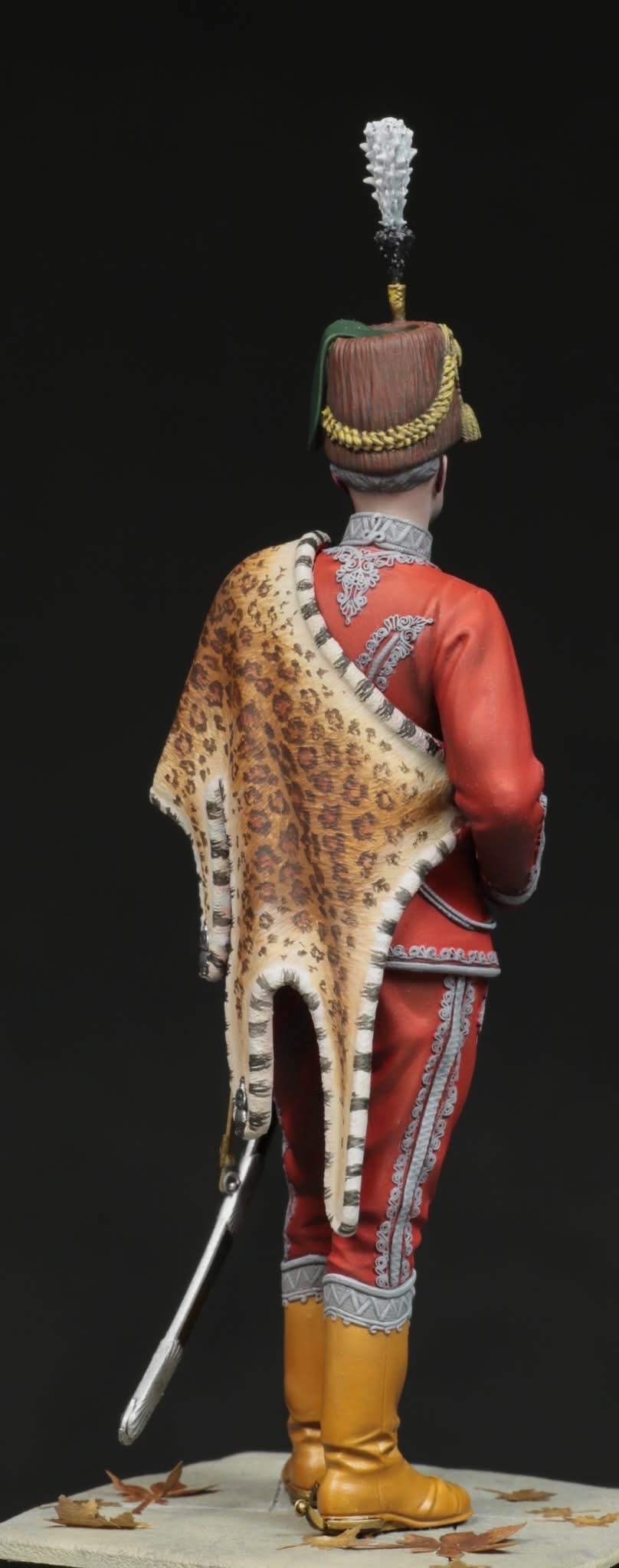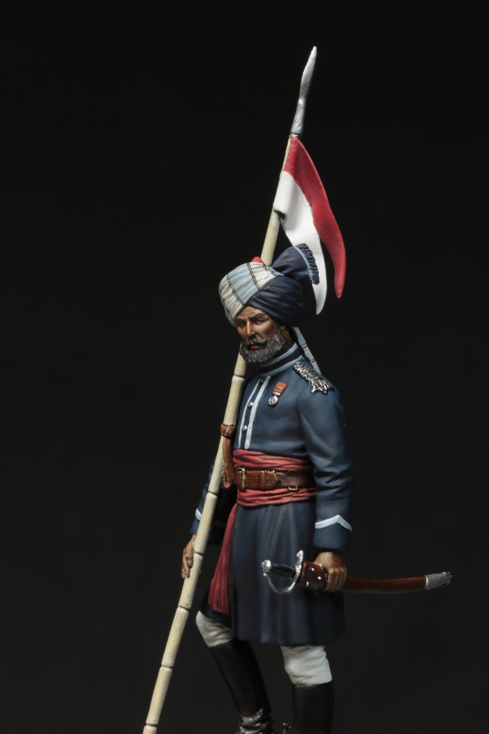 Researched the uniform as best as possible. Dark blue frock coat and not azure as art work provided. Turban is best guess based on art work by A C Lovett.