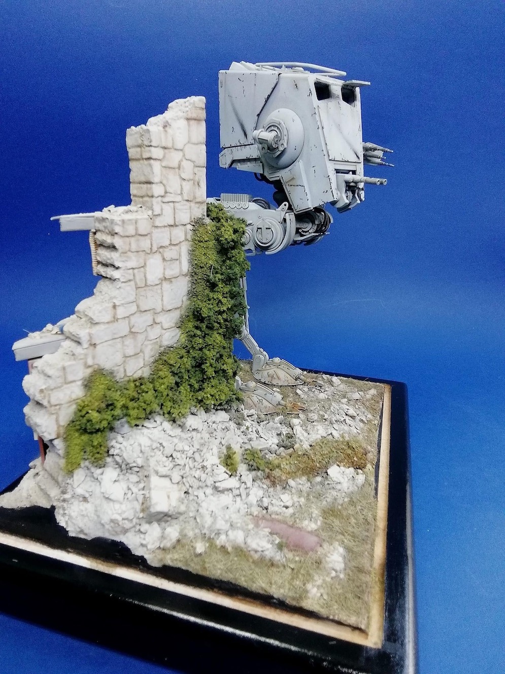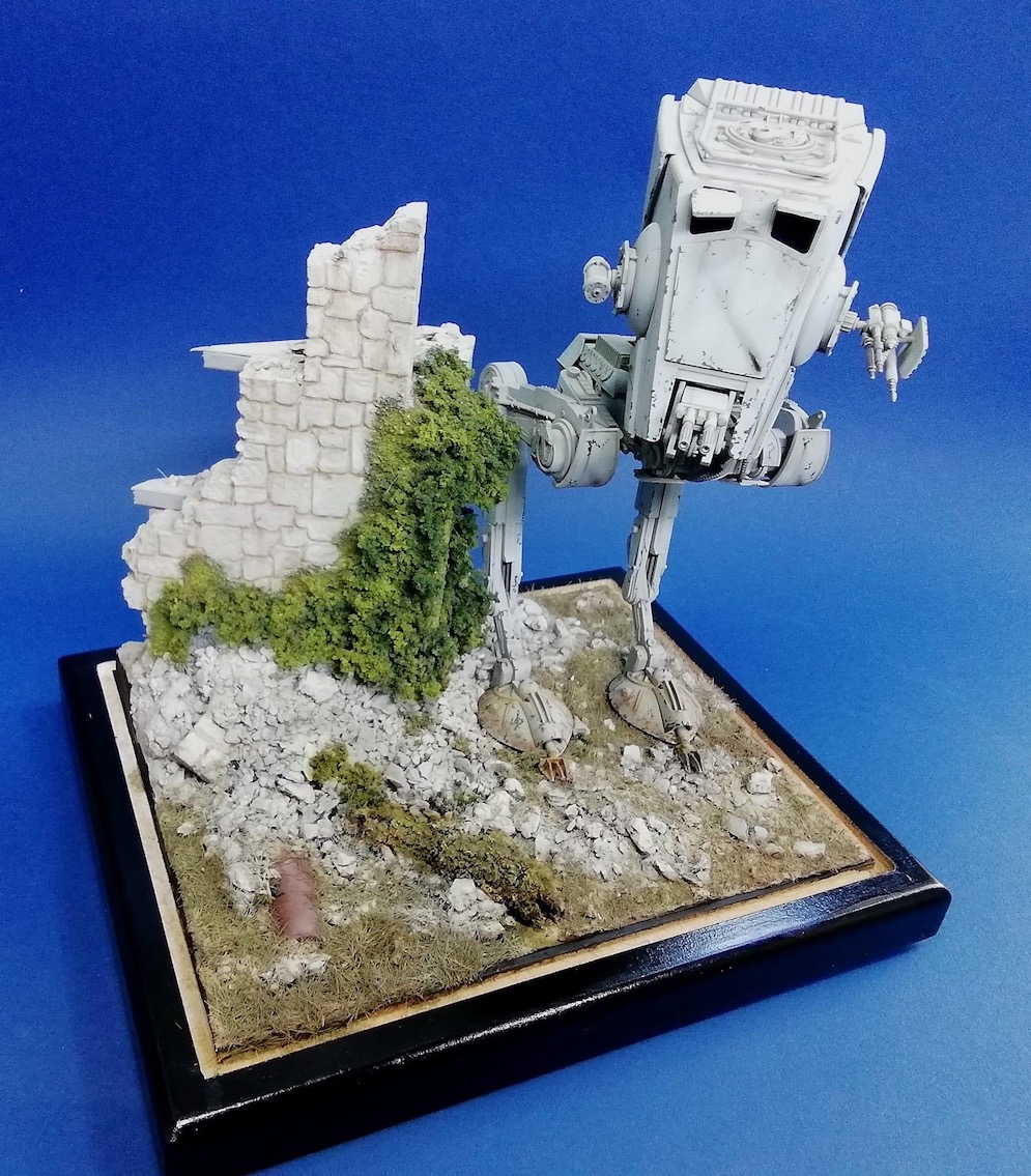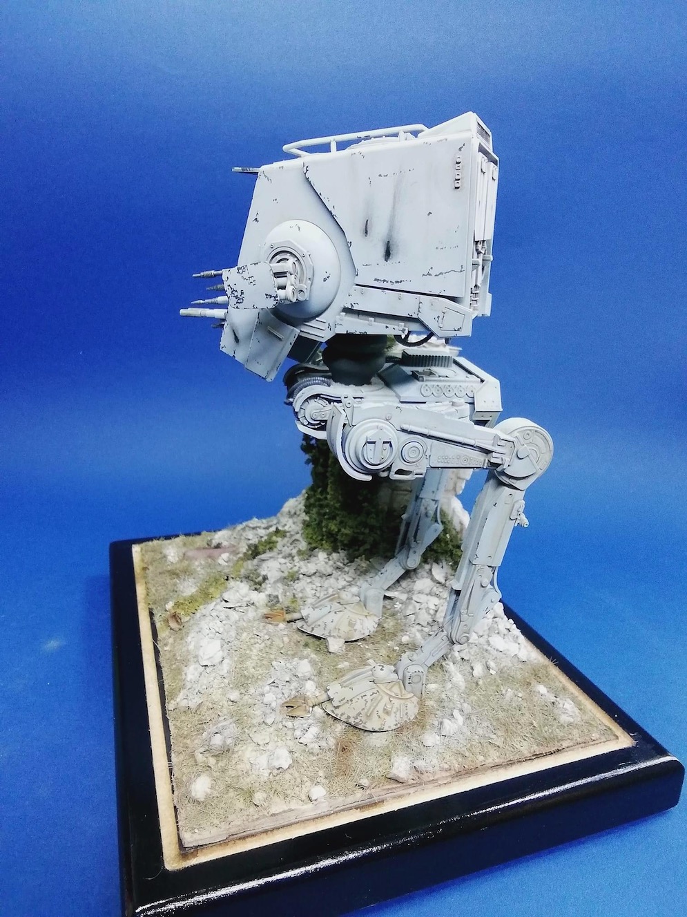 This is the excellent Finemolds kit of the Millennium Falcon in 1:144th scale (approx 8 ¾ inches in length). The model was built in “flight” skimming the surface of an asteroid from “Empire Strikes Back“. My only gripe was that although the cockpit interior is visible no figures are supplied. These were sourced from “N” gauge railway figures and painted to look like Han, Chewie, Leia and 3PO.