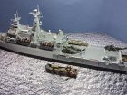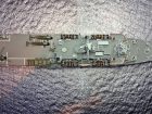 The kit assembles very quickly as the bulk (the hull) is cast as a single waterline piece (Kit is only available as waterline), the various cut outs in the sidea of the hull including the stern are plated over with pre-cut parts of photo-etch brass the largest being the piece that wrapps around the stern and sides of the the rear of the hull. I opted to cut the part into three pieces where the part is to curve around the stern, a little filler was required to blend away the join lines.The model was painted using my usual method , that being to spray the overall colour and post shade it before hand painting the remaining colours. The aircraft were painted in a similar fashion in that they were painted in the underside colour and the upper colours picked in by hand. The markings on the aircraft were picked in by hand as at the time of building there were no British SEAC/Pacific