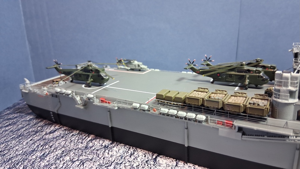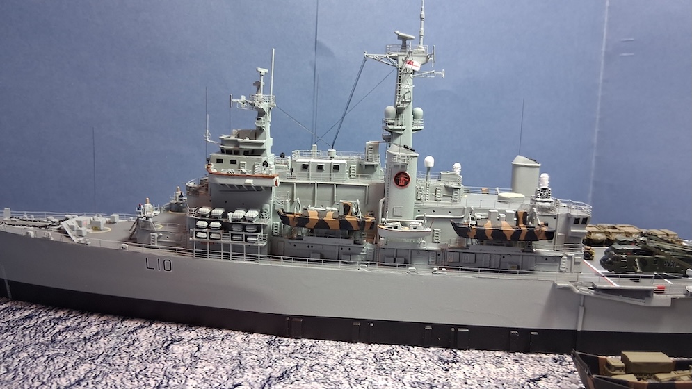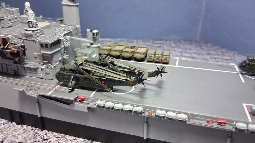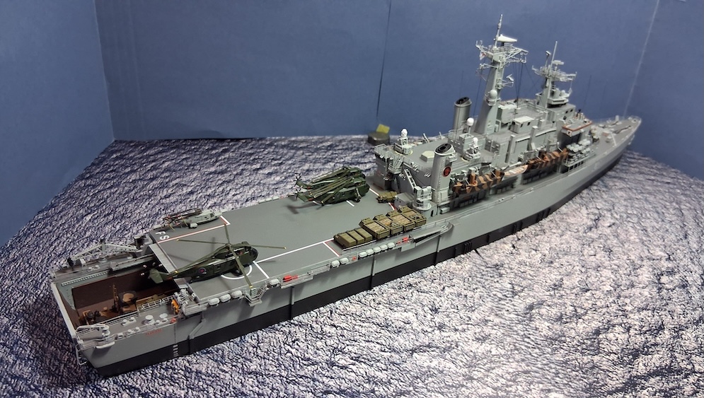 The ship is fitted and painted in her role of patrol vessel post-conflict in 1982. The ship didn’t have her identification Pennants showing and the flight deck letters were removed (painted over).