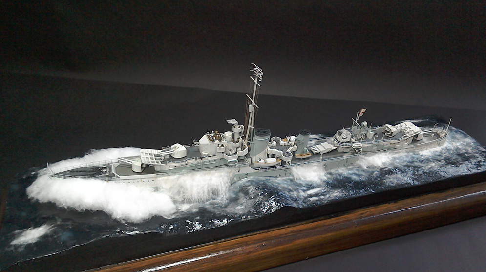 The models are of HMS Eskimo a Tribal Class destroyer, the stormy pics are of ship circa September 1942 when escorting Arctic Convoy s and the calmer sea the ship in Early 1945 when serving with Eastern Fleet fighting Japanese forces, note the differences in equipment and mast configuration.