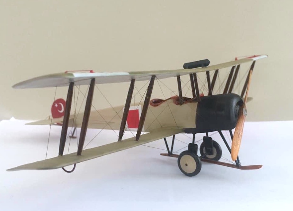 The markings were hand painted and it was rigged with rolled copper wire. I made this over 10 years ago. The model represents a machine from No 14 Squadron RFC in Palestine in 1916-1917.