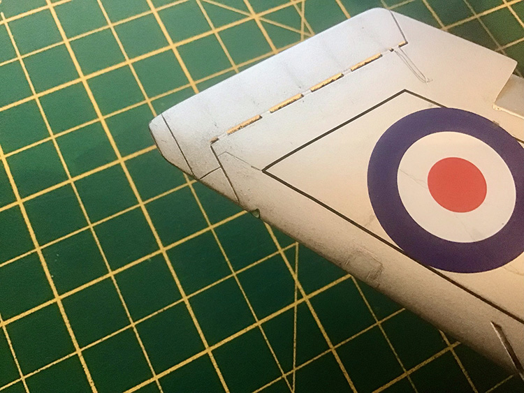 A close-up view of the starboard wing which shows the navigation light, a feature omitted in the kit.The recesses were filed out and the facing-edges painted with Tamiya Clear Green and Clear Red for the port wing.Clear lenses were added to each wing using Clear Epoxy Resin.