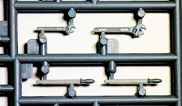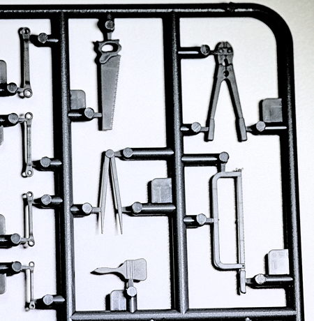 You will benefit from a careful glance at the sprues. They contain a splendid cross-section of all the normal tools you will find in a typical commercial or military workshop including saws, spanners, bolt cutters paint brushes and even a set of dividers.