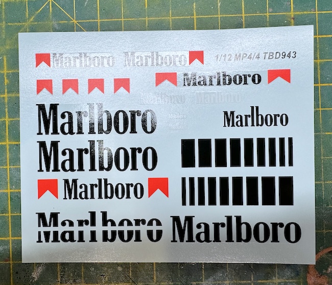 The kit has one major omission if you want an accurate representation of a 1988 MP4/4 – the Sponsor markings of the time, in this case Marlboro. Unfortunately, in this day and age model manufacturers are banned from including decals that advertise tobacco hence the lack of these in the kit. Fortunately, these can be sourced from the aftermarket and in my case, I located them on eBay (TBD 943) after a quick search but they did have to come from Italy which took a couple of weeks. The decals themselves are very well produced and well worth the effort of sourcing them. One thing these decals did cover if required are the marking for the car during the British GP where the words ‘Marlboro’ were roved and replaced with a black series of lines behind the cockpit.