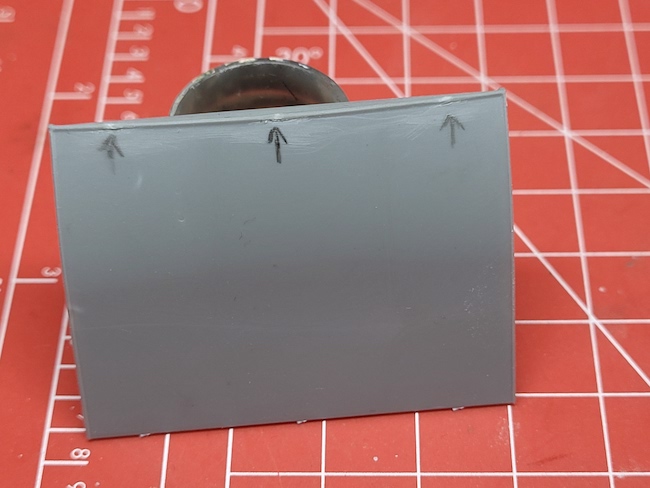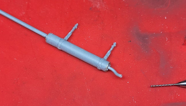 Like the radiator, the exhaust is built-up from plastic and etch brass parts. Here I’ve very carefully drilled out the end of the exhaust pipe.