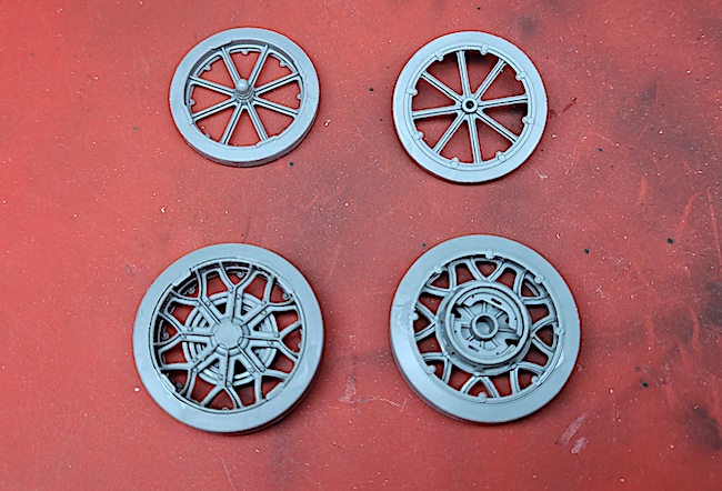 Both sides of front and rear wheels. The front wheels are a three part piece whilst the rear are constructed from 6 parts.
