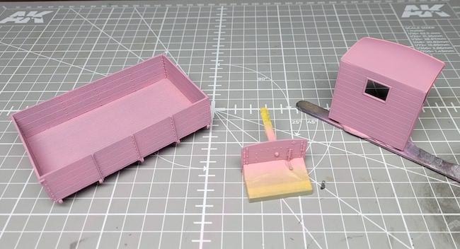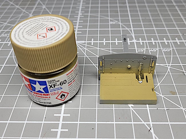 The wooden cab floor was first painted with XF-60 Desert Sand in preparation of oils later in the paint process.