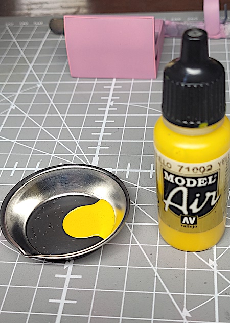 My chosen subject of a London 1918 coal wagon requires yellow paint. As most modellers will be aware, yellow paint is notoriously difficult to apply without a lighter base of some kind (usually white) to enable a good coverage. I chose Model Air’s 71002 Yellow. Now, to me it didn’t look dark enough and for this reason I chose to go with a base of pink mixed from Model Air white with a drop of their red. The aim being to “warm-up” the yellow.