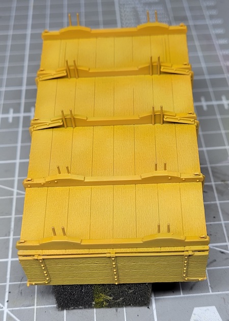 A touch of white is added to the yellow and is sprayed with emphasis on the centre of the planks using the darker yellow as shadow base between the planks!