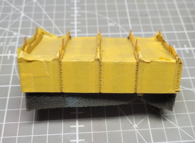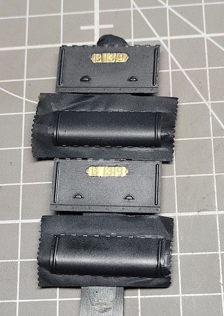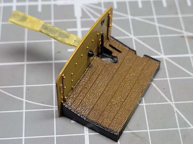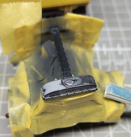 The iron work is masked-off and sprayed Tamiya X-84 Dark Iron and then dusted with pencil graphite.