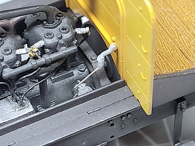 A quick check of work completed so far revealed a spot of glue or varnish on the top of the radiator and to the paintwork of the bonnet hinge panel!