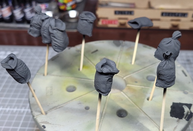 After a bit of cleaning-up of flash on the bags, they were painted Tamiya XF-69 NATO Black followed by a light coating of Tamiya XF-49 Khaki to the outside of the bags.
