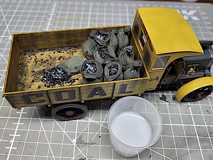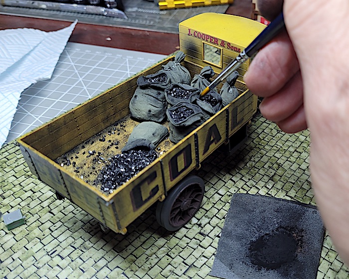The bags were placed in the flatbed and secured with cyanoacrylate glue, followed by the placing of the coal lumps. A few drops of watered down PVA glue applied with a pipette made sure that the scale coal lumps remained where they were placed.