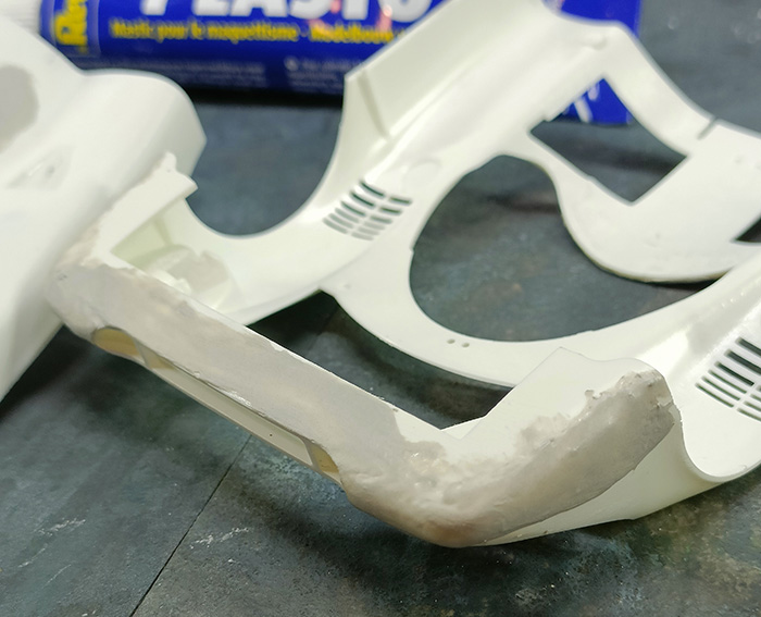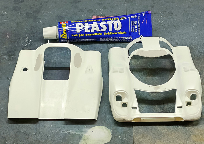On this kit, there are several vents that require filling, and the kit comes provided with some parts on the sprues to fill these gaps, so once they have been cemented in place, applying some Revell plasto filler (as recommended by the local model club members) was used over the seam lines for these added parts.