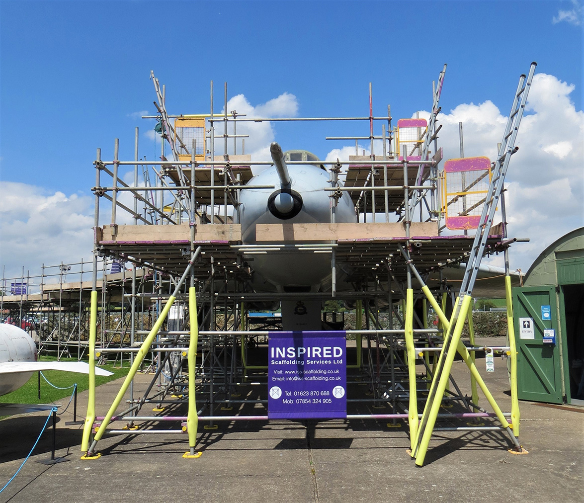 The extensive scaffolding work platform has been erected alongside key areas of the aircraft structure, which includes the wing and nose section of the aircraft. This allows museum staff and volunteers to access the aircraft in a safe and secure manner and is anticipated to be in position for around ten (10) weeks this summer.