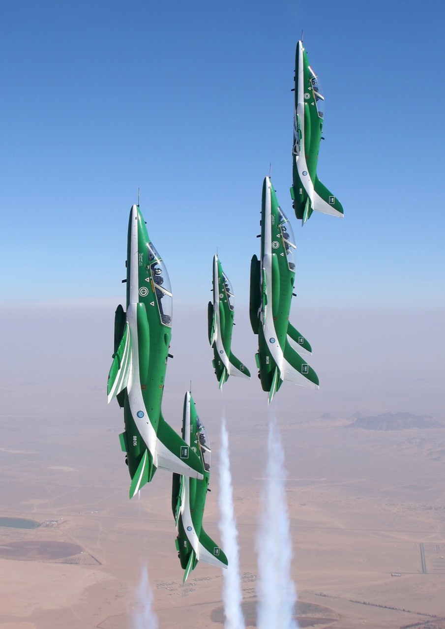 The Saudi Hawks, flying 6 BAe Hawk jets, painted in green and white the national colours of Saudi Arabia, were formed in 1998 to represent the Saudi nation and act as ambassadors across the world. The Team, who are based at King Faisal Air Base Tabuk, completed their first public display in 1999, over the capital city of Riyadh, which marked the 100th Anniversary of the nation of Saudi Arabia. Since then the team have gone from strength to strength, completing tours across the Middle East and Europe, appearing in the UK for the first time last year.