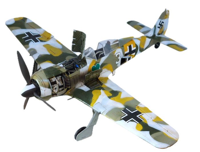 In early 1938, Focke Wulf Flugwerke in Bremen were commissioned by the RLM to design a fighter to operate alongside the Bf109. The technical director, Kurt Tank, planned to create a rugged, easy to maintain aircraft which could operate off the most basic of airfields. To power the new fighter, Tank chose the powerful and reliable BMW 801 14 cylinder radial engine instead of the water-cooled designs that dominated at the time. This eliminated vulnerable radiators and associated pipework which increased survivability. The reduced drag benefit of having no radiators was normally offset by the increased frontal area of a radial engine. The clever close cowling of the engine coupled with a large spinner and an engine driven cooling fan to boost airflow through the narrow frontal duct meant drag was kept to a minimum. When RAF pilots first encountered the new fighter over France, they actually reported it as having a water cooled engine – so good was the packaging. To further increase survivability, Tank chose electrically powered undercarriage, flaps and trim systems. The balanced controls utilised rods and bell cranks instead of cables. The wide main landing gear and retractable tail wheel were very robust and eradicated the problems which beset the Bf109.